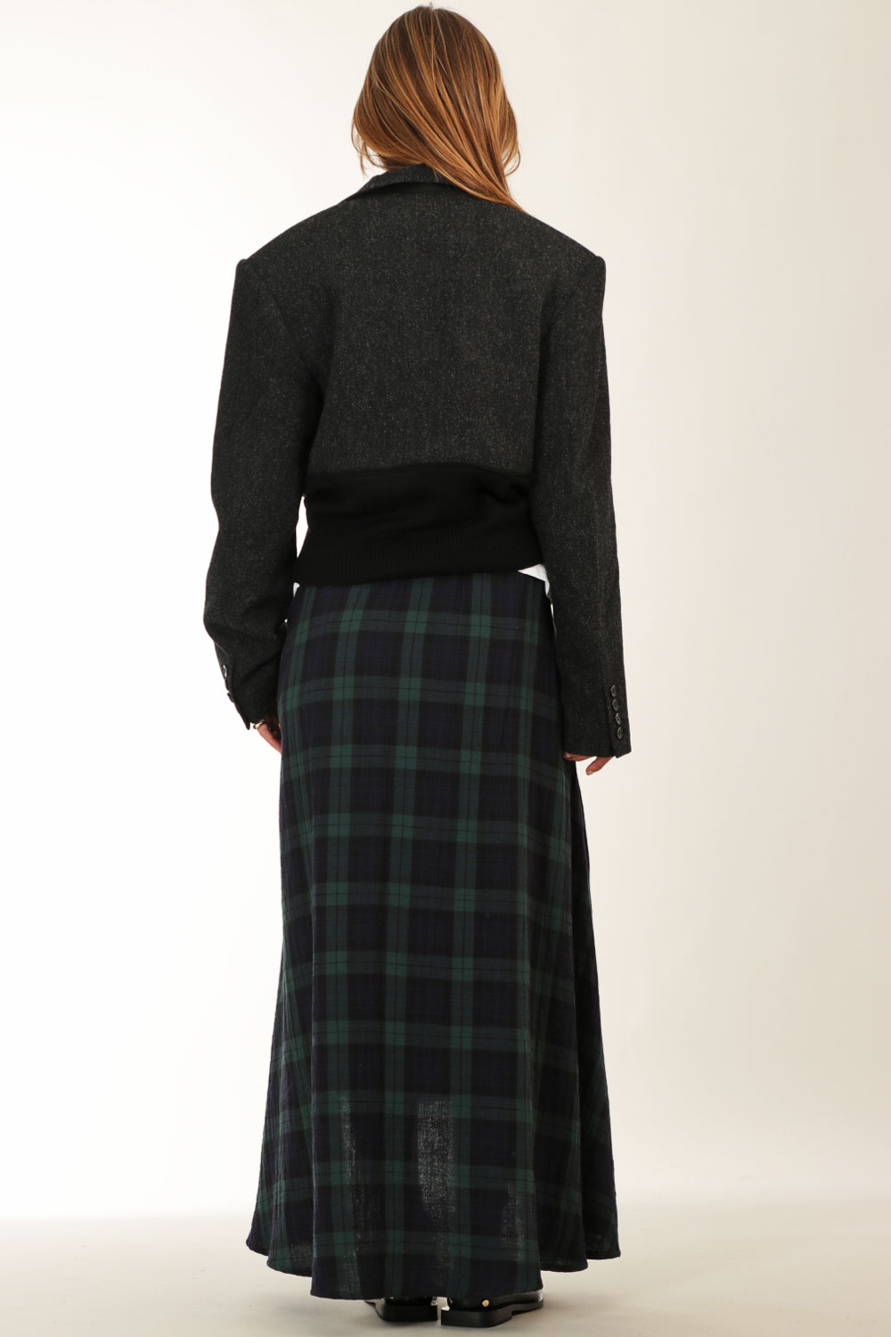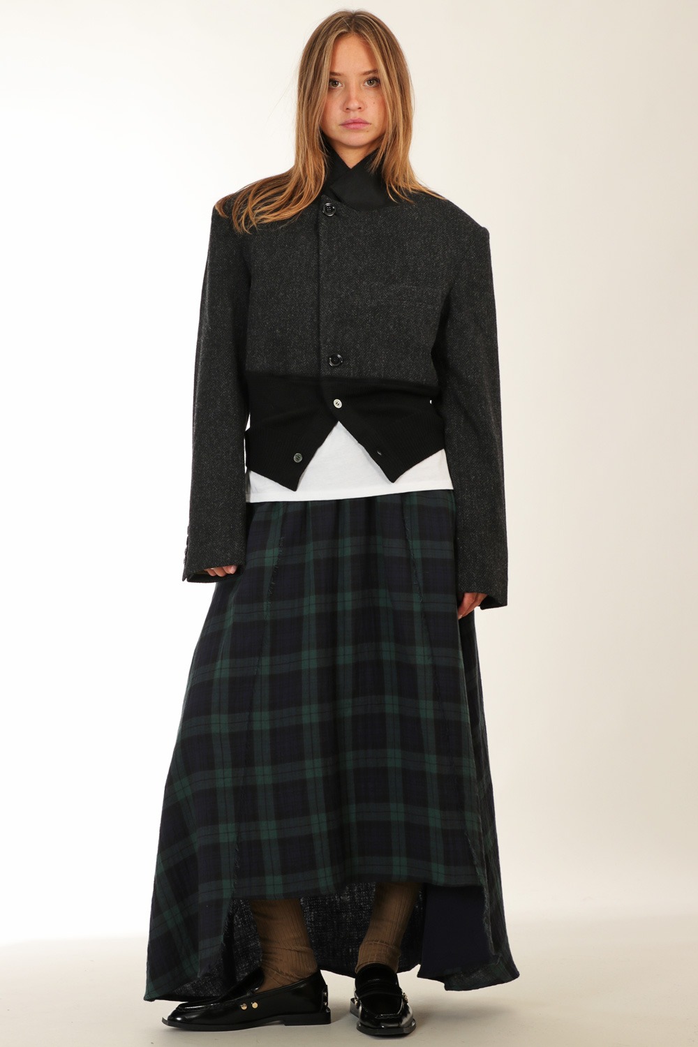 The tailored Rib Blazer Jacket by 6397 is cut in a Japanese wool herringbone with strong shoulder and peak lapel. Best worn closed with lapel up. Wool rib trim at bottom. Button closure with iridescent lining.