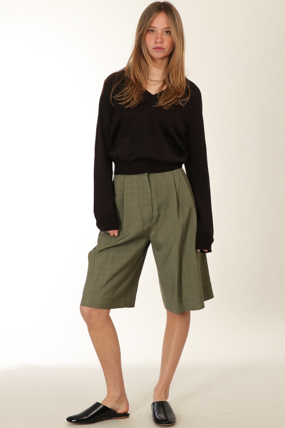 features long sleeves, V-neck, two patch pockets on the front,