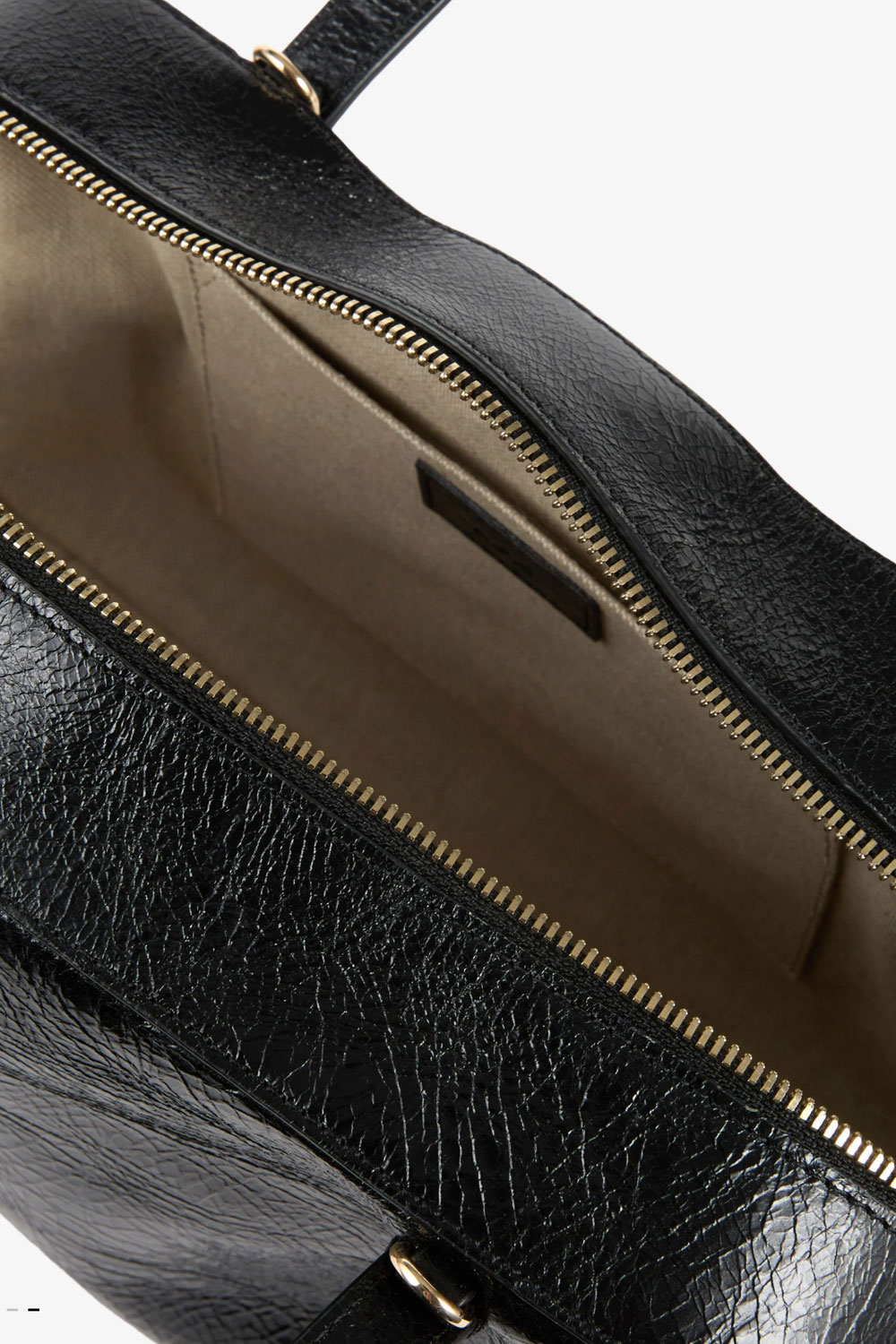 shoulder strap adjusts with a goldtone metal buckle to carry crossbody,
