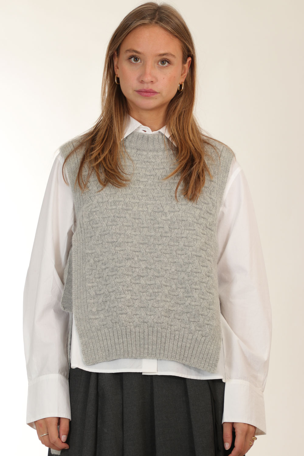 The Bodil poncho from a-t-w-o-o-d is knitted from a fine 100% baby alpaca wool in a playful cable pattern and exclusively stocked at Sky Amsterdam.