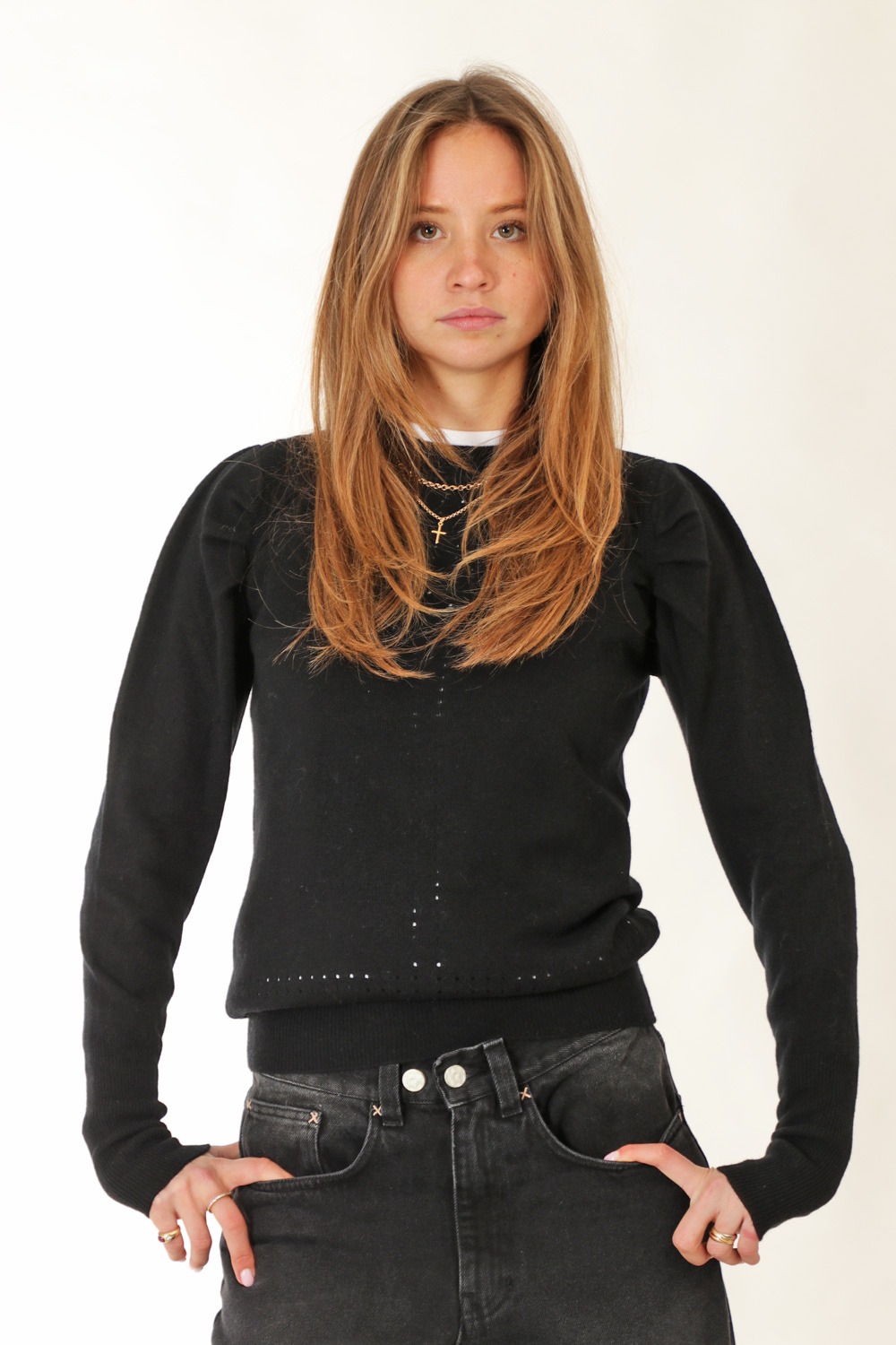 An a-t-w-o-o-d signature in wool and cashmere. The Pearl sweater features feminine puff sleeves and refined pointelle detailing. Exclusively stocked at Sky Amsterdam.
