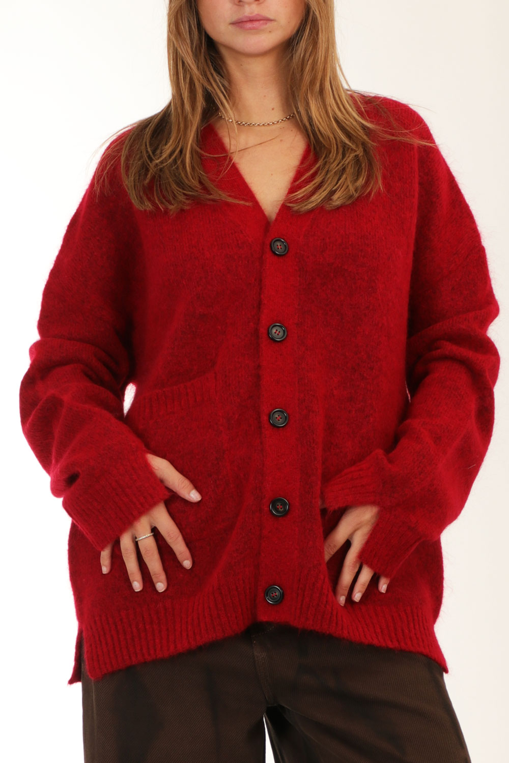 Adnym’s red oversized Teth cardigan is crafted from a soft mohair blend and is cut to an exaggerated fit with dropped shoulders and an over the hip length.