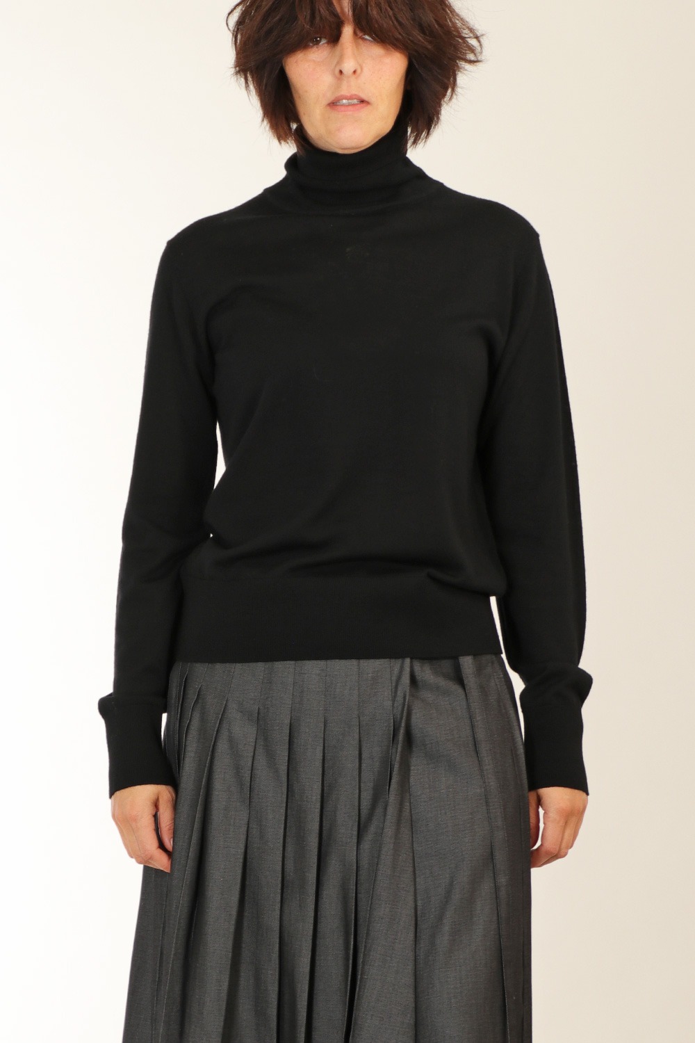 This 14430_myknit black turtleneck sweater by Forte_Forte is crafted from a superfine merino wool with ribbed detailing. Cut to a classic, relaxed fitted style.