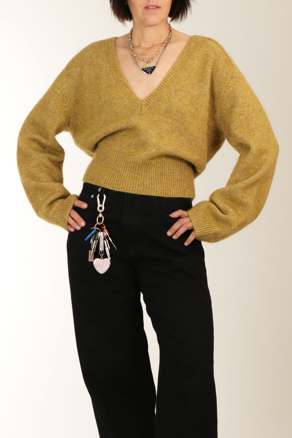 The Mix Deep V-neck Sweater by Ganni has a deep V-neckline and a slightly cropped silhouette that is perfect for a strong look and makes a great layering piece.