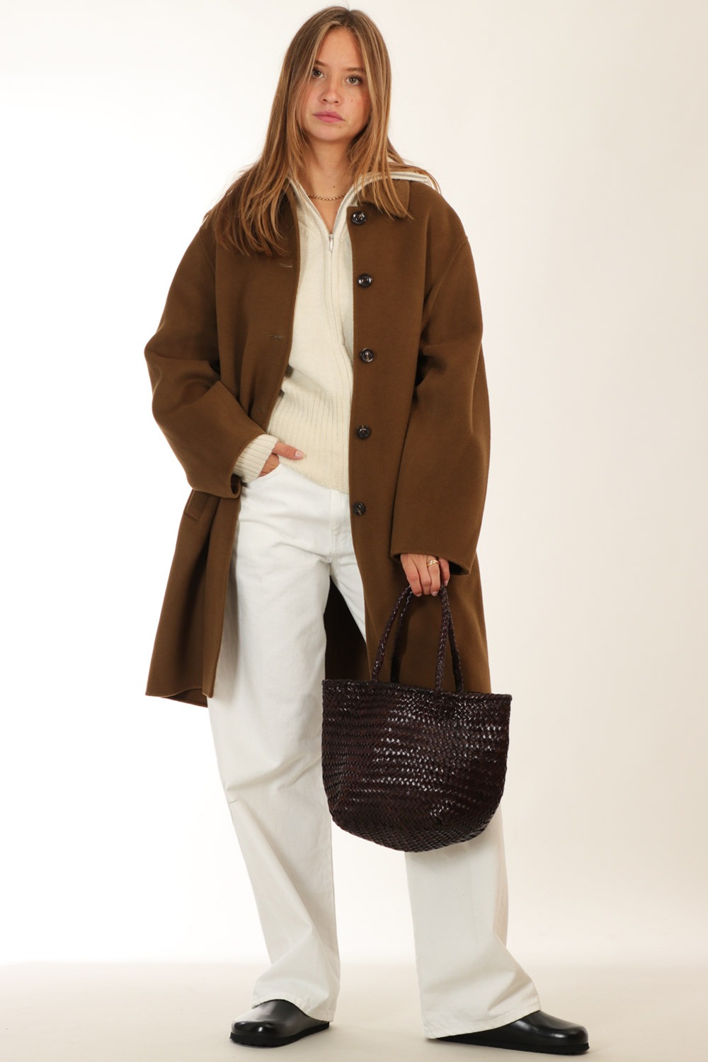 The Juno bag is a hand woven bucket bag, crafted from cow leather, that can be worn comfortably in your hand or around your shoulder. The small tote easily fits all your daily belongings.