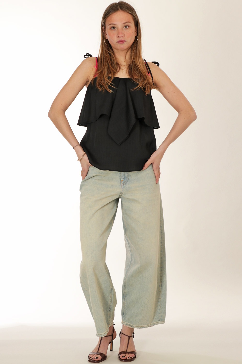 thin adjustable straps at shoulders,