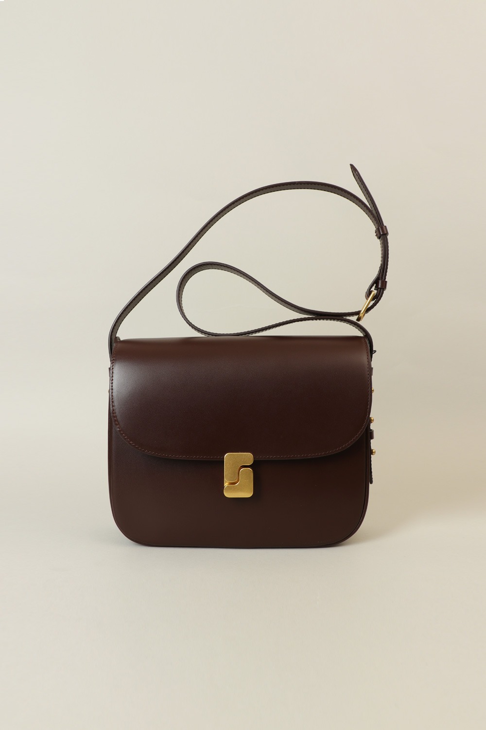 large front flap with golden “S” monogrammed clasp,
